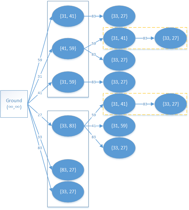 假设有两个砖块,三条边分别为 \(31, 41, 59\) 和 \(33, 83, 27\),那么整张 DAG 应该如下图所示。