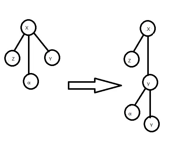 Rake 操作指定一个度为 \(1\) 的点 \(x\),而且与点 \(x\) 相邻的点 \(y\) 的度数需大于 \(1\),设点 \(y\) 的另一个邻点为 \(z\),我们将点 \(x\)、边 \(xy\) 的信息放入边 \(yz\) 中储存,并删去它们。如图所示。