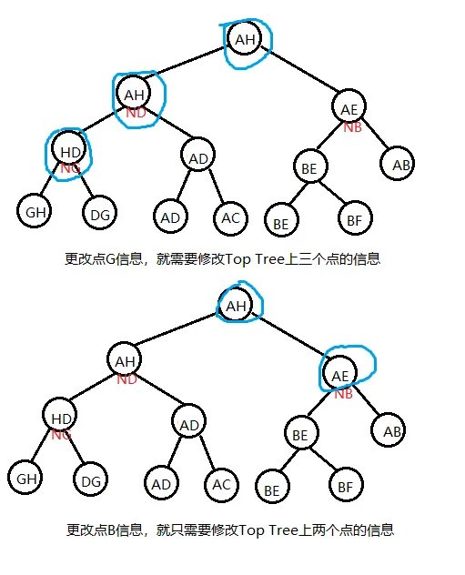 现在我们在维护时要对 \(T\) 中某个点 \(x\) 的权值进行修改,很明显,我们就需要更改 Top Tree 中所有簇信息包含 \(x\) 的节点信息,这样做单次时间复杂度会是 \(O(n)\) 级别的。