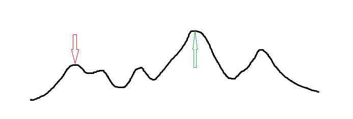 但是对于多数需要求解的函数,爬山算法很容易进入一个局部最优解,如下图(最优解为 \(\color{green}{\Uparrow}\),而爬山算法可能找到的最优解为 \(\color{red}{\Downarrow}\))。
