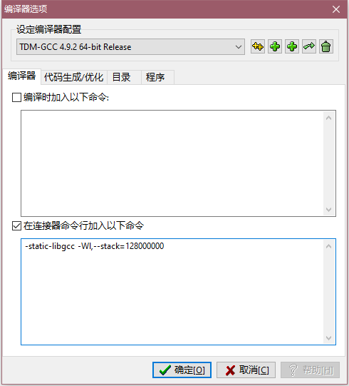 在 "连接器命令行加入以下命令" 中加入 -Wl,--stack=128000000 命令。