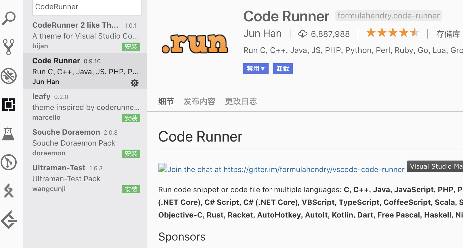Code Runner 是一个可以一键运行代码的扩展,在工程上一般用来验证代码片段,支持 Node.js、Python、C、C++、Java、PHP、Perl、Ruby、Go 等 40 多种语言。