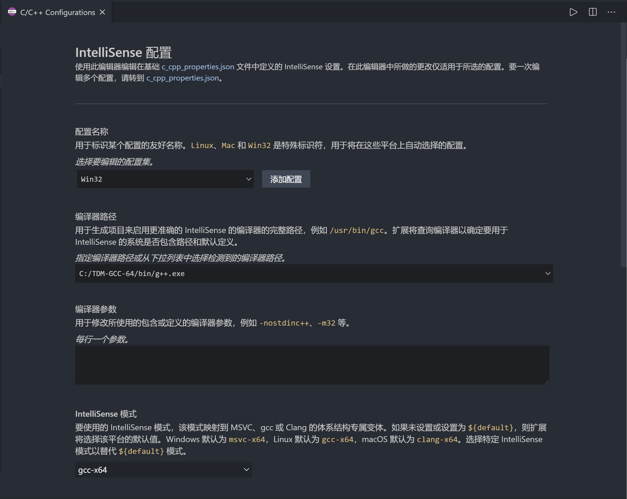 如果你使用 Clang 编译器,在「IntelliSense 模式」中选择 clang-x64 而非默认的 msvc-x64;如果你使用 G++ 编译器,选择 gcc-x64 以使用自动补全等功能。否则会得到「IntelliSense 模式 msvc-x64 与编译器路径不兼容。」的错误。