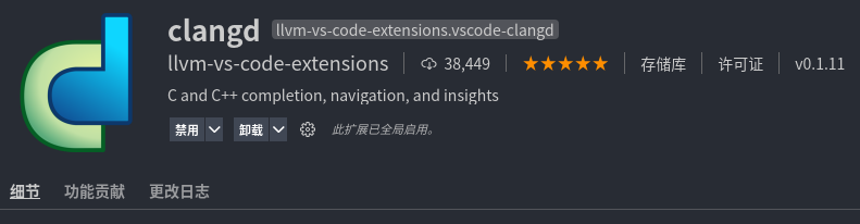 由于功能冲突,安装 clangd 扩展后 C/C++ 扩展的 IntelliSense 功能将被禁用(调试等功能仍然使用 C/C++ 扩展)。如果 clangd 扩展的功能出现问题,可以查看是否禁用了 C/C++ 扩展的 IntelliSense 功能。